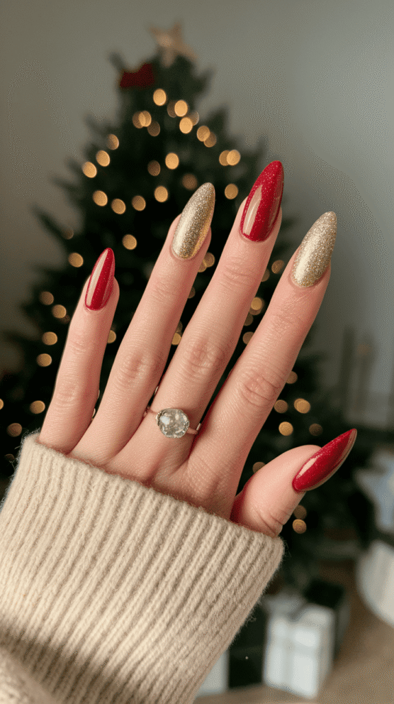 I like mixing solid red nails with one or two full glitter gold ones, it balances perfectly.