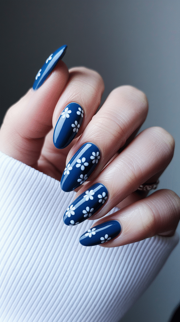 You get that deep navy base, then soften it with tiny floral details that pop beautifully.