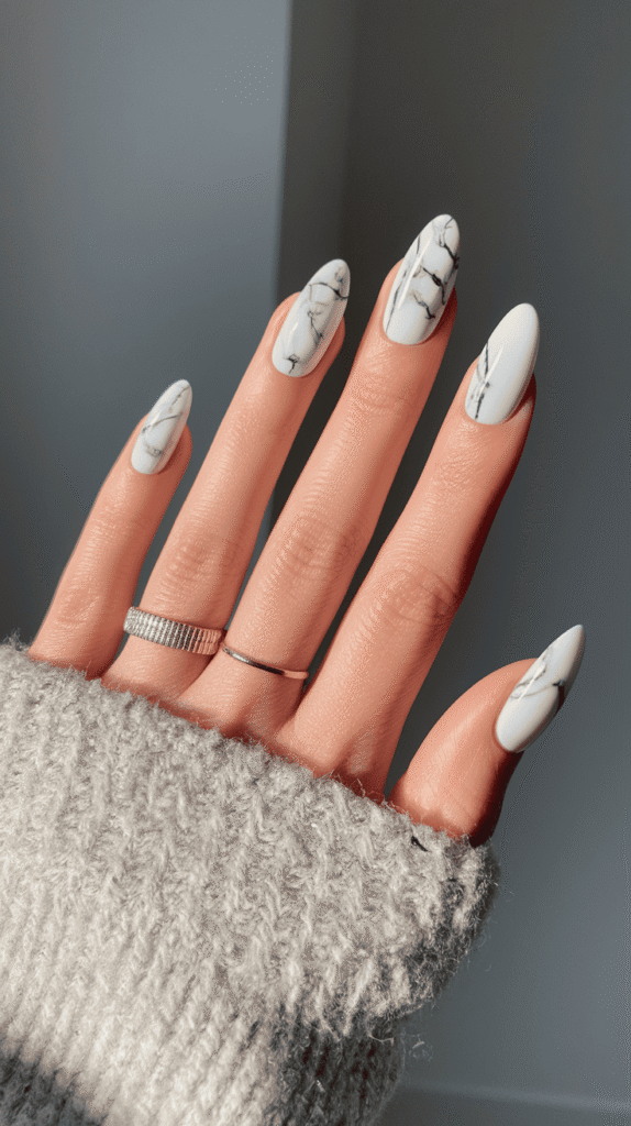 Snowy marble nails look soft, artistic, and slightly dramatic in the best way.