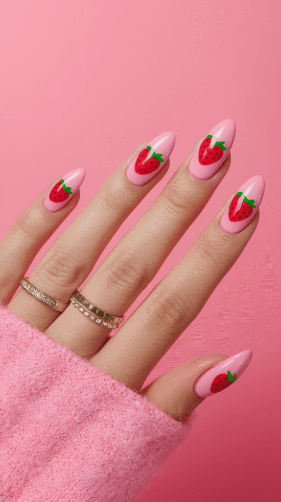 If bright red feels a little too bold, pink strawberry nails offer a softer alternative.