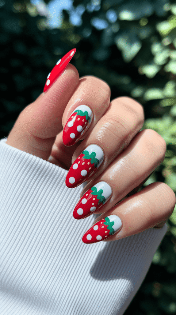Polka dots already bring a retro vibe, so pairing them with strawberry nails creates a surprisingly fun combo.
